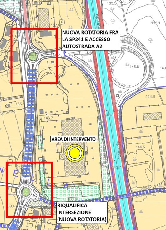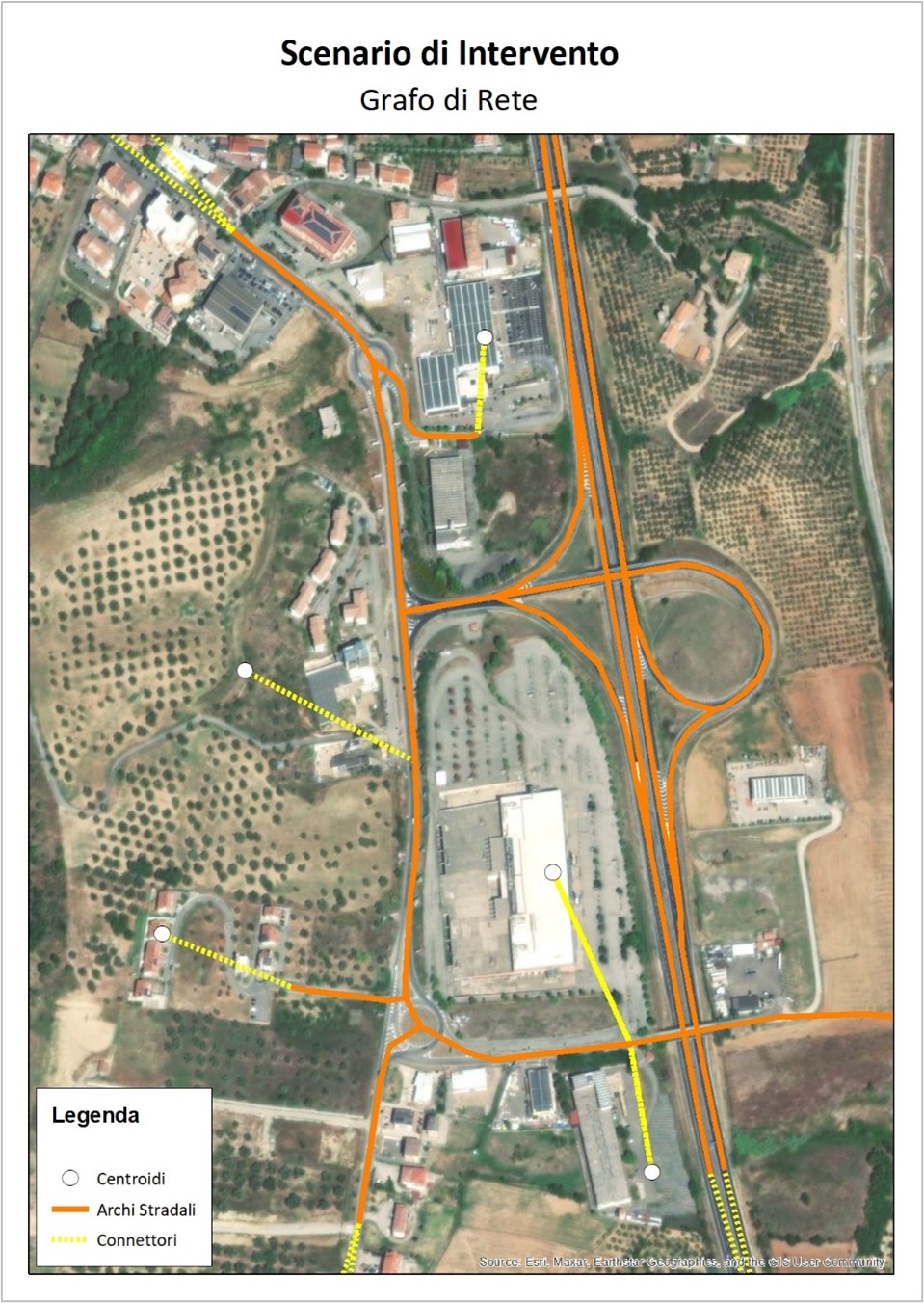 - Scenario di Riferimento: rappresenta lo scenario rispetto al quale è stato valutato l’impatto del progetto di ampliamento del comparto commerciale sulla viabilità. Dal punto di vista infrastrutturale la rete viene implementata modificando lo schema di accesso all’autostrada A2 dalla SP241; inoltre in questo scenario è stata recepita la previsione del PSC del Comune di Montalto Uffugo di realizzazione di un nuovo asse stradale di collegamento fra via Coretta e via Sele. Per quanto riguarda la domanda di trasporto, al traffico attualmente circolante sulla rete sono stati aggiunti i flussi veicolari indotti dall’attivazione di un vicino comparto logistico di prossima realizzazione e dalla componente dell’insediamento commerciale esistente sull’area di intervento, ad oggi non più in esercizio;